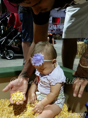 We found the cows and oh how they became very close to my father and Geraldo. Forced to milk the cow by my father along with the girls and step mother and I, Geraldo faced his fears. By faced his fears I don’t think I’ve ever seen someone milk a cow so fast! Next were the grain textures where Elleanna was trying to steal corn with her toes after her father took her out of playing in it. Yes she has those “finger toes” like her father… And I. Cow tags with the kids names and some educational activities then it was off to enjoy the rest of the fair.