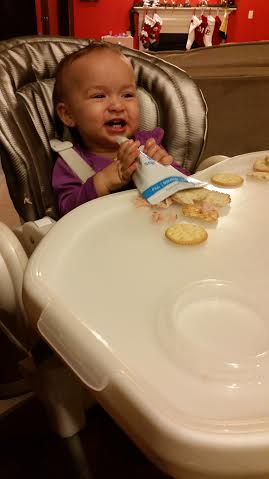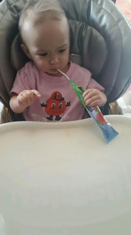 I have become so desperate in the last few weeks… Multiple bath times a day because of Miss Independent wanting to feed herself just wasn’t working for this working mother. I tried everything as you can see including taking a straw into her yogurt and tapping it. I may be a bit creative, wacky, though it worked for a few minutes or half the yogurt until she began squeezing it with much more pressure.