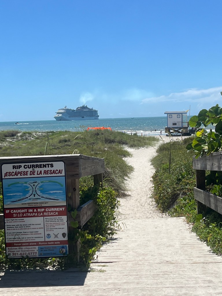 It was so different walking the beach with them, while I listened to mom’s yelling out to their children. “Give your sister her bucket back!”, “Don’t do that!” And all the lovely things I probably have said within the past few weeks. We had also brought the children to the same beach earlier in the week. My aunt had a baggy for my shells, just as I had done for the children when we went. I felt like a true child. Let’s be honest, I can remember what my children may want or need, but when it comes to me… We’re winging this trip and waiting for the SOS texts to start coming in. “When are you getting home?” “I’m hungry, what’s for lunch/dinner?” This time it was different though, I was laughing and picking up shells. Remembering parts of my childhood, while speaking to my mother. We walked down the beach north, to Jetty Park, where my aunt and uncle remembered being able to get a beverage. Instead of just a beverage, there was a small cafe within the bait shop. That was a first for me, eating inside a bait shop, but it was peaceful, the air conditioner was on and the view of the cruise ships making port was perfect and, of course our thirst was quenched.